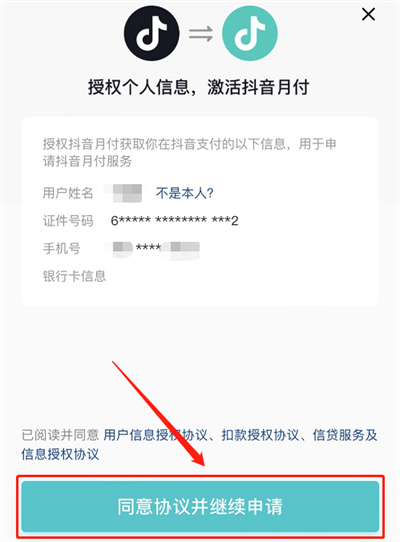 5. 在弹窗中确认个人信息、身份证号码及电话号码无误后,点击“同意协议并继续申请”,按照系统指引完成开通申请。