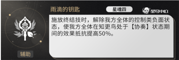 施放终结技时,解除我方全体的控制类负面状态,使我方全体在知更鸟处于[协奏]状态期间的效果抵抗提高50%。