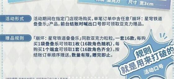 活动期间在指定门店现场购买,单笔订单中含任意崩坏:星穹铁道叠叠乐产品,前台结账时喊出口号即可领取亚克力赠品。