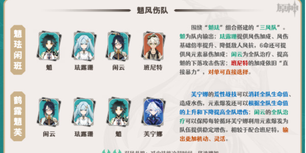 1、魑为队内主攻手负责输出,珐露珊提供风伤加成、风伤基础倍率提升、降低敌人风抗,6命还可提供风元素暴伤加成;