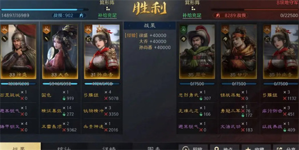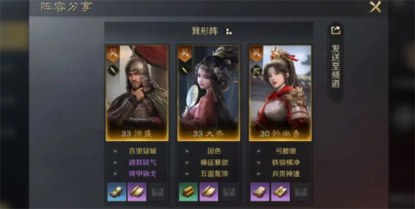 1、此阵型输出稳定,低战斗损耗可平级开地,避开持续“缴械”敌,越级开荒亦可承受。在【方圆阵】解锁前,可用【箕形阵】让徐盛单前排。