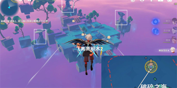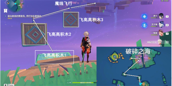 3、按照图示路线前行,借助“飞高高积木”前往破碎之海,打开中间锚点,到达悬崖飞起“飞高高积木1”,旋转飞高高积木2和3。连接3个神谕柱后,用“魔线飞行”攀登上层。