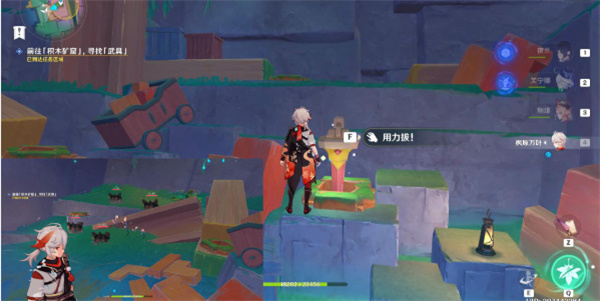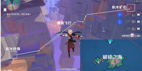 7、传送到破碎之海中间锚点,飞往矿窟中间裂缝,按图示路线走,拾取“积木炸弹”,用魔线飞行安装于积木矿石上。